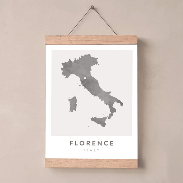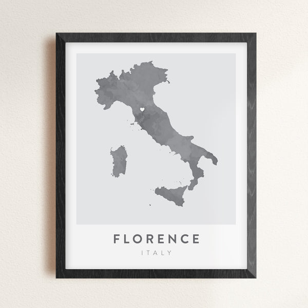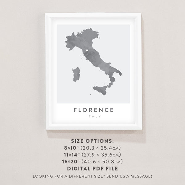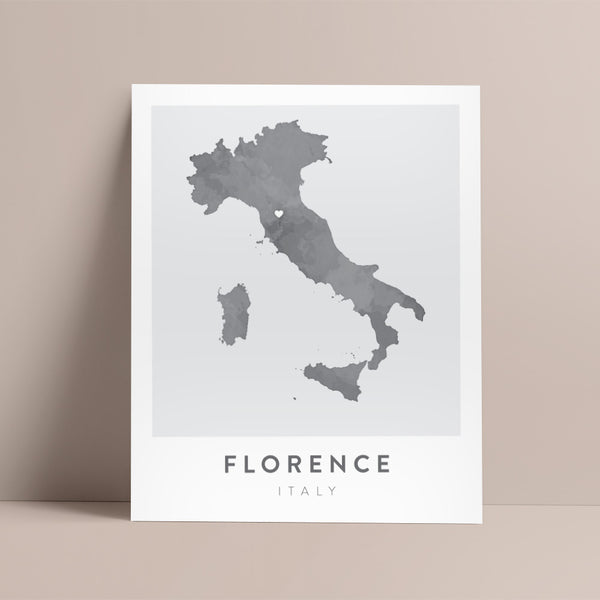This original artwork features the shape of Italy with a watercolor effect and a small heart directly over Florence.